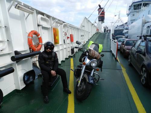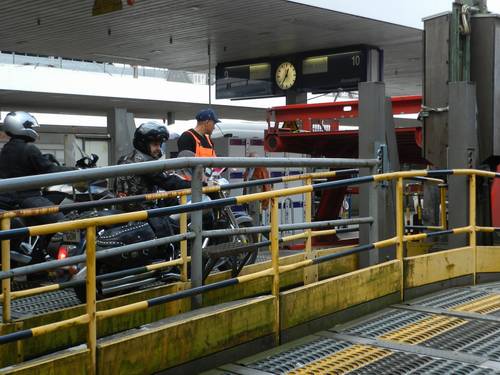 Sortim del ferry, i els cotxes es barregen amb les motos. Per tornar a agrupar-se, els moteros es foten a 110-120 en una carretera