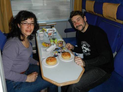 Com en el viatge d’anada, ens porten l’esmorzar al compartiment. Muntem la taula i esmorzem els tres estupendament.