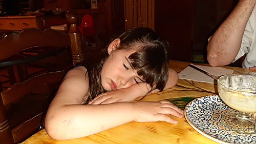 El dia ha sigut tant intens que la Martina es queda adormida a la taula i l'hem de portar en braços a la casa...
