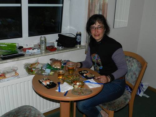 verda, safates de sushi, currywurst, llaunes de salmó, galetes... Sopem a l’habitació, veiem una mica la tele