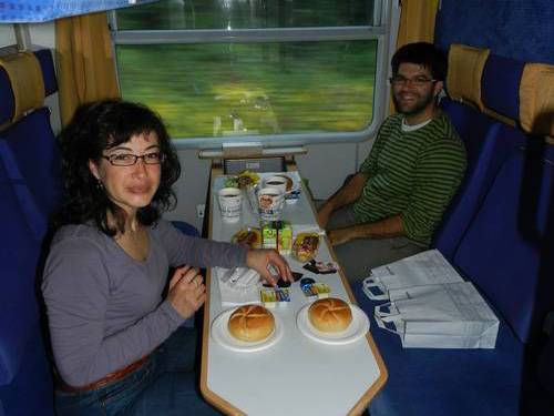 Com en el viatge d’anada, ens porten l’esmorzar al compartiment. Muntem la taula i esmorzem els tres estupendament.
