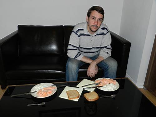 bajamos al bar a tomar unas birras (18€!). Cuando vamos a hacer la cena vemos que no hay ninguna sartén, así que hemos de hacer el salmón en una cazuela,