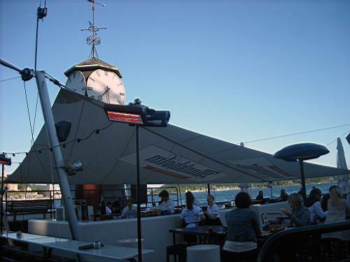 Volvemos al puerto donde están haciendo unas carreras de esquí sobre ruedas. Hacemos unas cervecitas en un lounge-bar, donde las carpas son otra vez