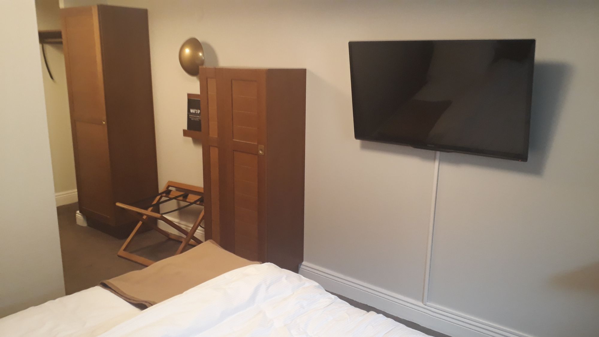 tele a sobre, un penja-robes (cap armari) i una minitaula amb cadira. En fi, perquè més? El bany està prou bé.